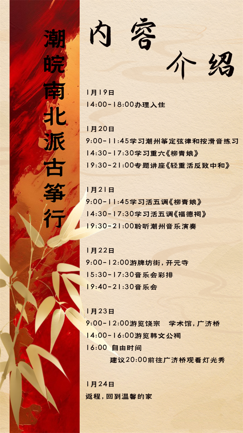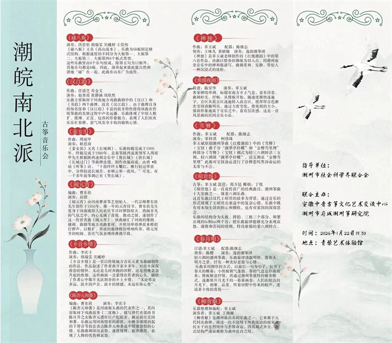 由潮州市社会科学界联合会指导,安徽中音古筝文化艺术交流中心与潮州市府城潮州第研究院联合主办的“潮皖南北派”古筝音乐会,即将于2026年1月22日19:30在青藜艺术体验馆奏响。