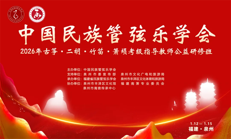 为推动中国民乐传承发展,2026年古筝、二胡、竹笛、箫埙考级指导教师公益研修班13日在福建省泉州市丰泽区文化馆正式开班。为期3天的本次活动汇聚全国10余位民乐名家与200余名基层教学者,依托福建泉州文化特色,通过研修培训、采风活动、乐动文庙迎新年、汇报展演等板块,搭建起中国民乐交流发展平台。