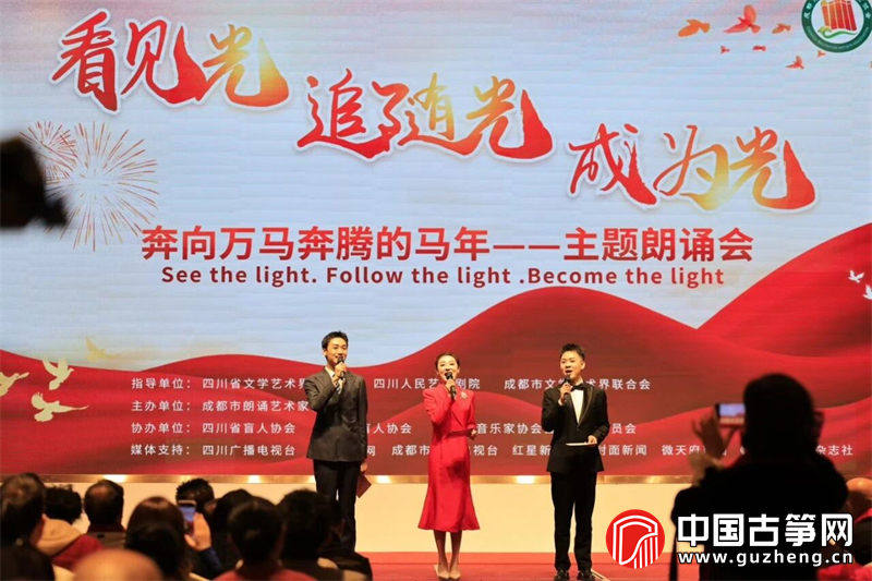 本届论坛以“看见光”为主题,并聚焦“AI朗诵能否超越人类”的前沿议题展开深度对话。在随后举办的“看见光·追随光·成为光”主题朗诵会上,成都筝会杨帆、王卉荟、梁晨三位老师优雅登台,以经典的古筝曲目作为朗诵环节间的艺术桥梁。筝声时而清越如泉,时而深沉似海,不仅完美烘托了《我们看见光》、《光的赞歌》等朗诵作品的情感氛围,更以独特的东方器乐魅力,诠释了“光”的多元意境与希望力量,赢得了现场嘉宾与观众的高度赞誉。