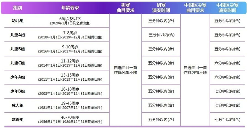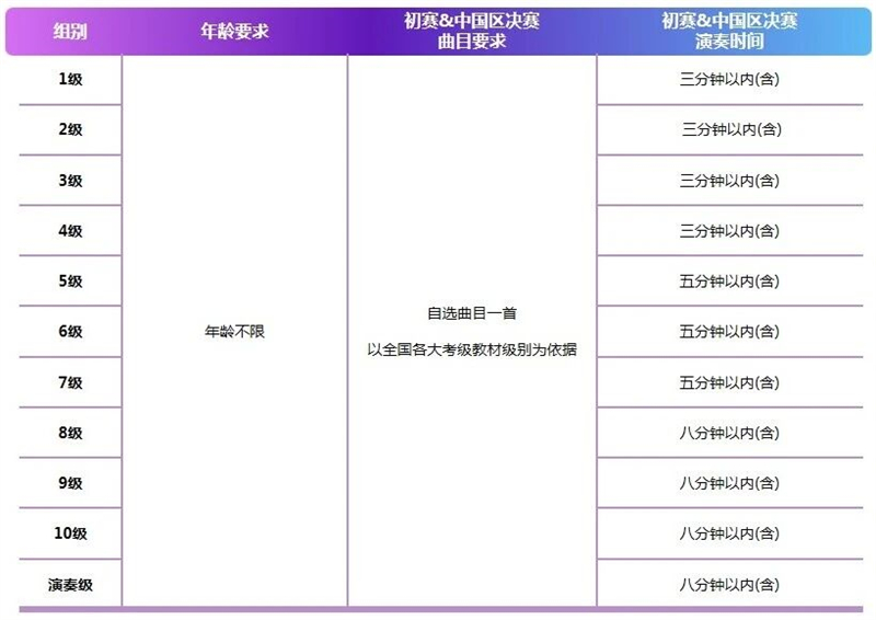 初赛曲目与决赛曲目不可重复,曲目需与报名级别相符。
