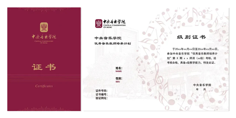 参加培训后,颁发中央音乐学院“优秀音乐教师培养计划”培训证书;考核合格后,颁发相应的级别证书。