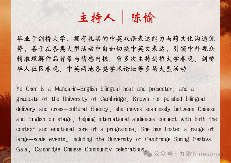 作为中国驻英使馆文化处支持项目,并且作为中国文旅部2026“欢乐春节”全球系列活动之一,在这场精心规划和准备的国乐专场音乐会中,我们将以全新的曲目组合,呈现中国送给全世界的节目礼物,向世界展示中国民族音乐的当代表达。