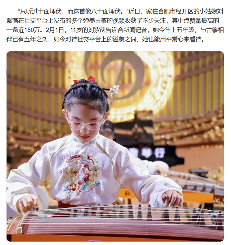 合肥小姑娘刘紫菡第一次见到古筝时,还不知道这东西将在五年后为她带来近150万的点赞。