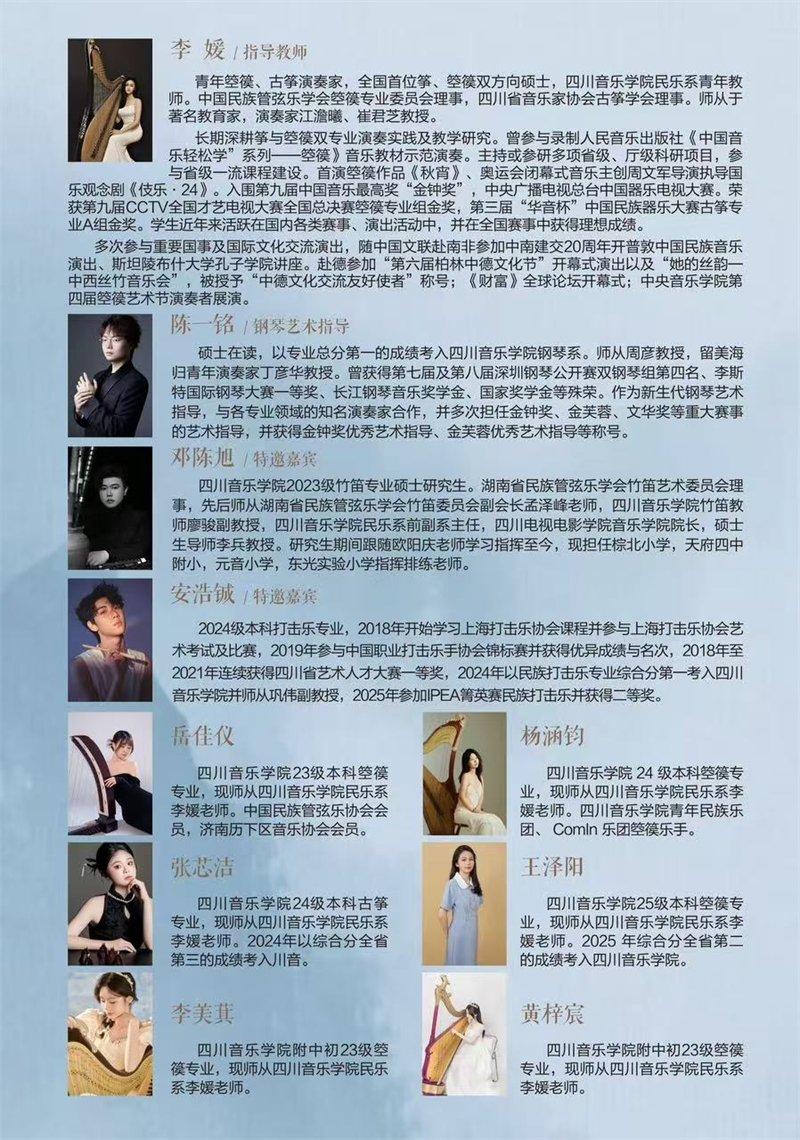 青年箜篌、古筝演奏家,全国首位筝、箜篌双方向硕士,四川音乐学院民乐系青年教师。中国民族管弦乐学会箜篌专业委员会理事,四川省音乐家协会古筝学会理事。师从于著名教育家,演奏家江澹曦、崔君芝教授。