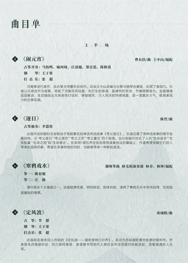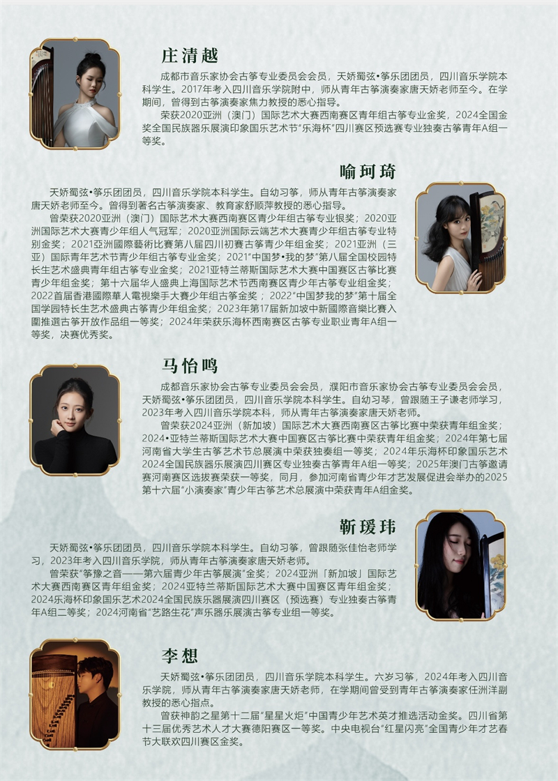 本场音乐会参演学子涵盖附中、附高及本科各阶段年龄,将集中展示不同学段的教学成果与多元风格曲的艺术魅力,以灵动筝声诉说成长与蜕变,尽显学子的艺术风采!
